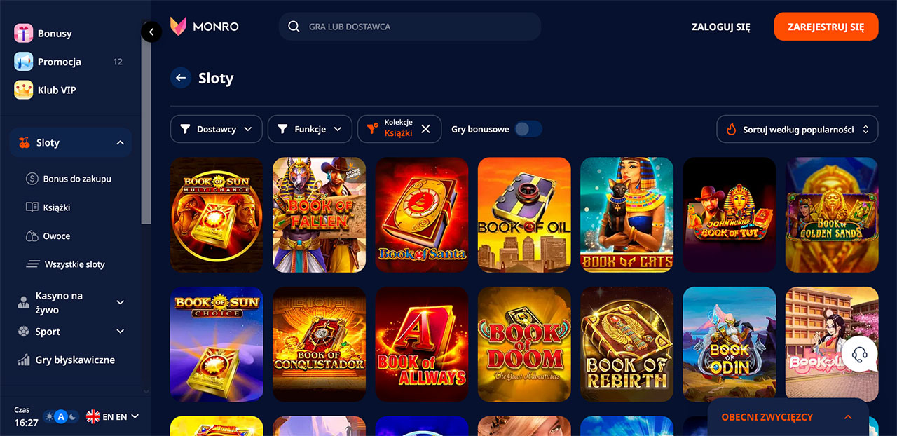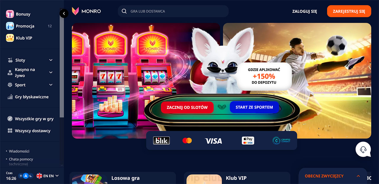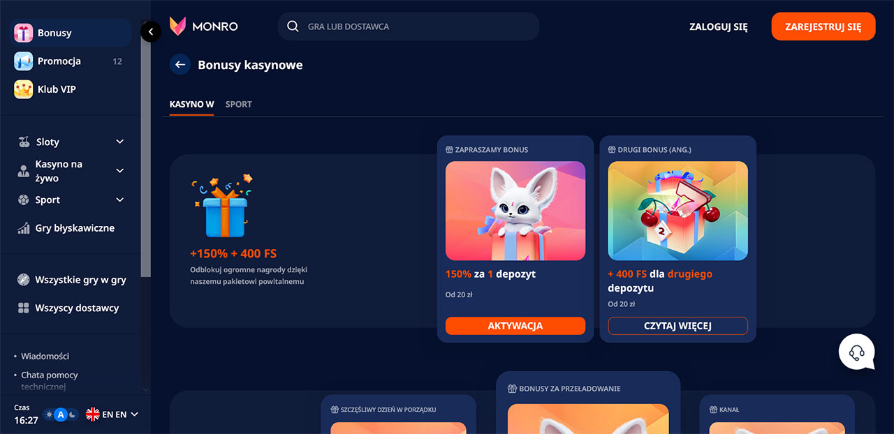 Bonus powitalny: | 225% az do 2500zł + 400 Darmowe spiny |